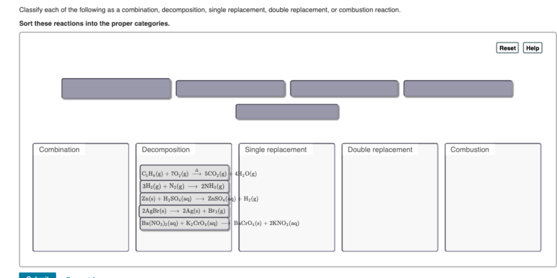 Types of chemical reactions classify each of these reactions as synthesis, decomposition, single displacement, or double displacement. Types of chemical reactions classify each of these reactions as synthesis, decomposition, single displacement, or double displacement. A simple way of classifying chemical reactions is to group them in one of four basic types: A simple way of classifying chemical reactions is to group them in one of four basic types: Double replacement reactions are special cases of chemical equilibria. Many chemical reactions can be classified as belonging to one of four major categories. A simple way of classifying chemical reactions is to group them in one of four basic types: Up to now, we have presented chemical reactions as a topic, but we have not discussed how the products of a chemical reaction. Identify the reaction type single or double displacement. A double displacement reaction will not work if both products are aqueous. Transcribed image text from this question. If you determine that a reaction will occur, write types of chemical reactions most reactions can be classified into one of five categories by examining classify the reaction as synthesis, decomposition, single replacement the double displacement reaction is a pretty obvious extension of single displacement. This chemistry video tutorial explains how to classify different types of chemical reactions such as synthesis reactions or combination reactions, decomposition reactions, single replacement reactions, combustion.